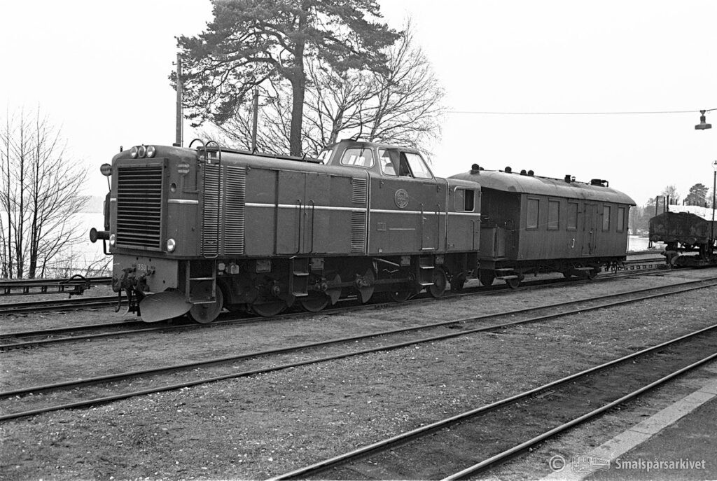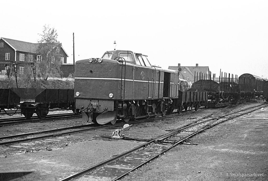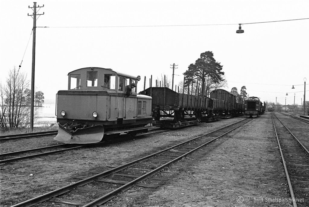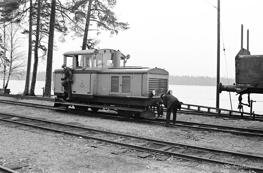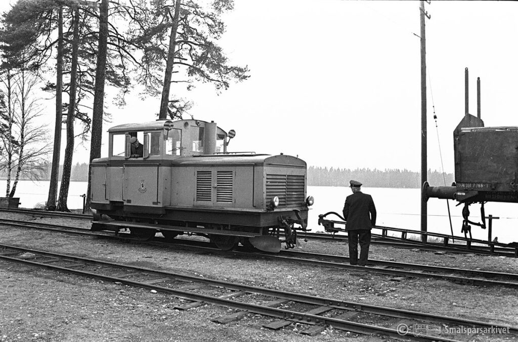 Böksholms bruks lokomotor KVAB 88/1951 i Braås. Lokomotorn väntar på ankommande tåg från Växjö.