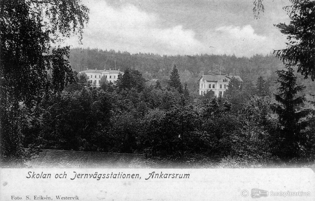 Vy från Ankarsrum. Till vänster i bild syns skolbyggnaden och till höger stationsbyggnaden.