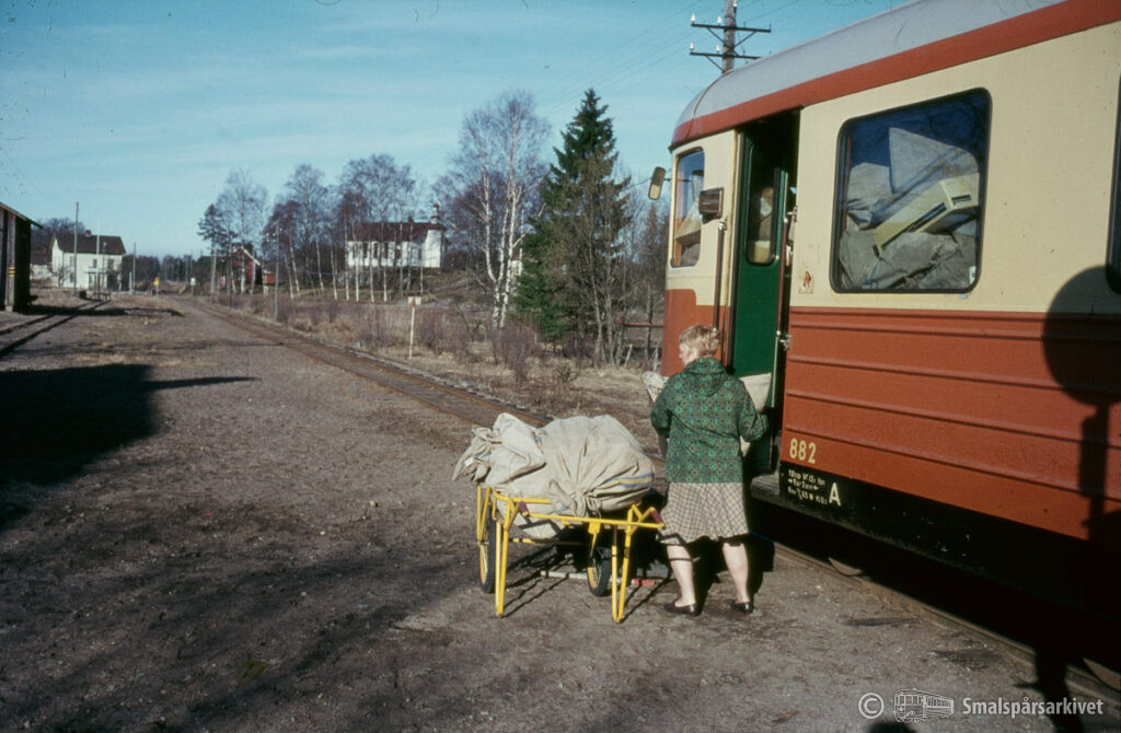 Lossning av post från rälsbuss SJ YBo5p 882 i Åsaka.