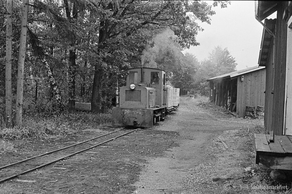 Motorloket Dragos (Deutz 55107/1952) passerar utfarten från bruket med ett lastat tåg till Påskallavik.