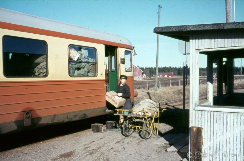 Lossning av post från rälsbuss SJ YBo5p 882 i Främmestad.