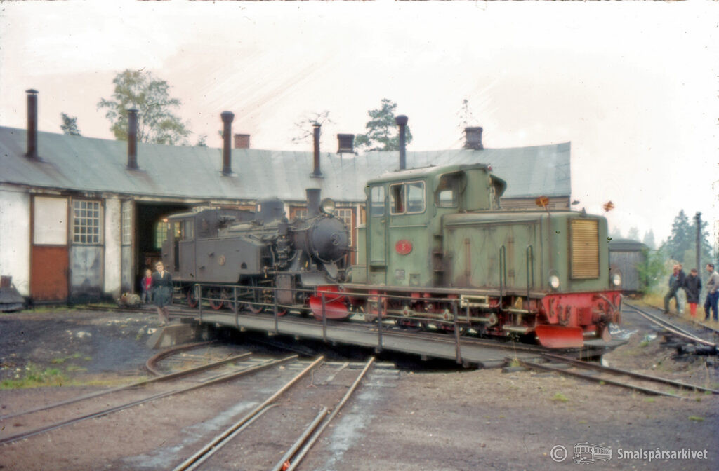 Motorlok HBA 3 och ånglok HFJ 11 vid lokstallet i Fredriksberg.
