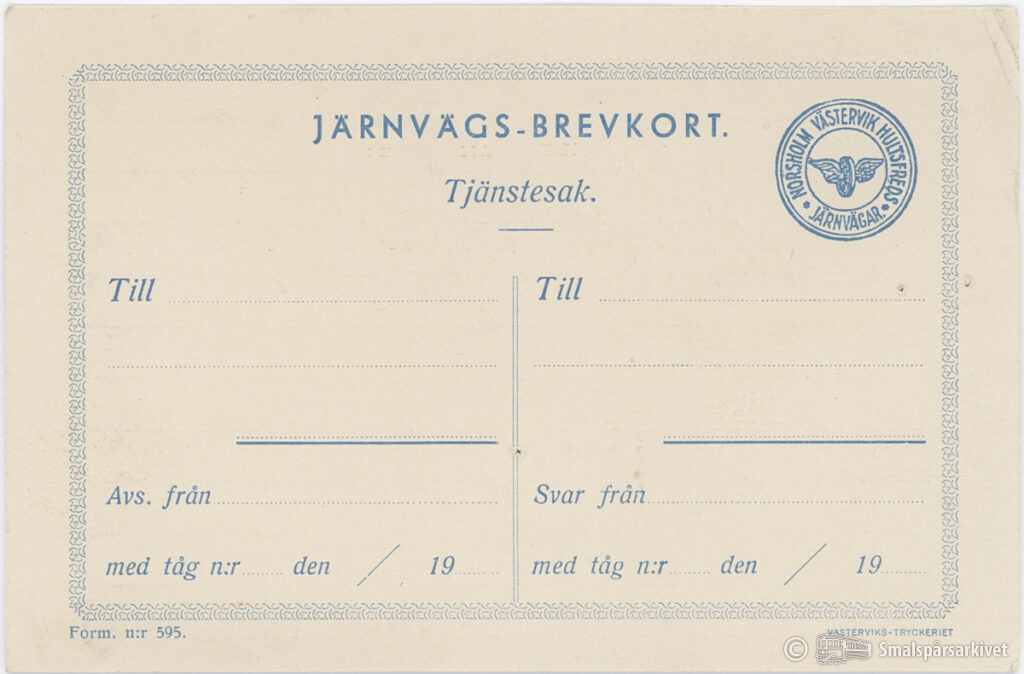 Järnvägs-brevkort för Norsholm–Västervik–Hultsfreds Järnvägar