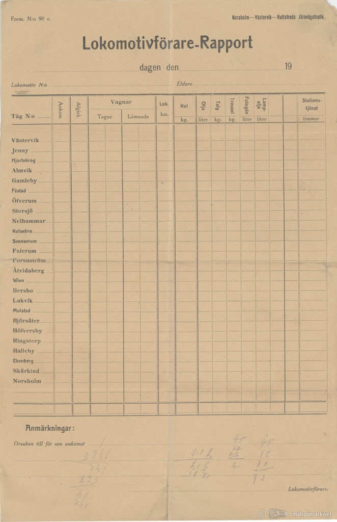 Blankett för lokomotivförare. Utgiven av Norsholm–Västervik–Hultsfreds Järnvägstrafik.