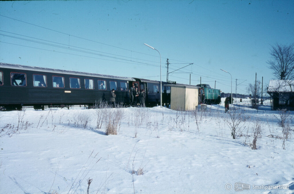 Diesellok SJ Tp 3513 + Bop 929 (f.d. SRJ Co/Bo 118) + 926 (f.d. SRJ Co/Bo 115) med SJK:s utfärdståg vid Malsta hållplats.