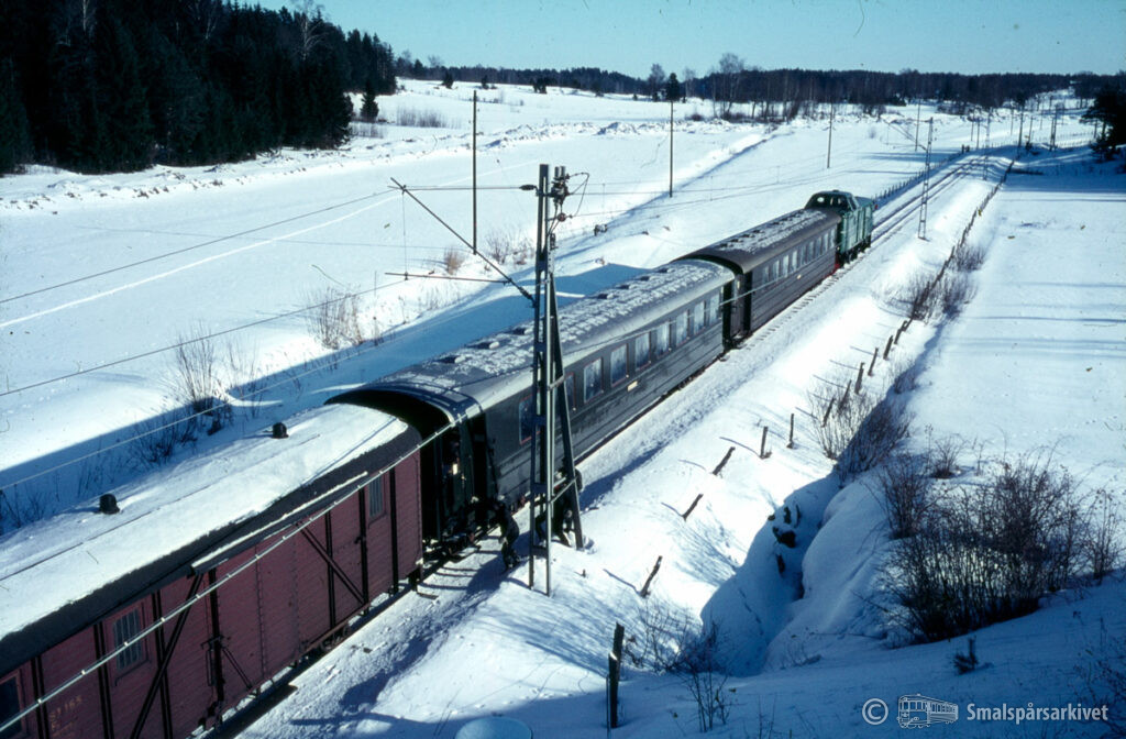 Diesellok SJ Tp 3513 med SJK:s utfärdståg vid Nånö banvaktstuga. Närmast SJ Fp 165 (f.d. SRJ F 232) + SJ Bop 926 (f.d. SRJ Co/Bo 115) + 929 (f.d. SRJ Co/Bo 118).