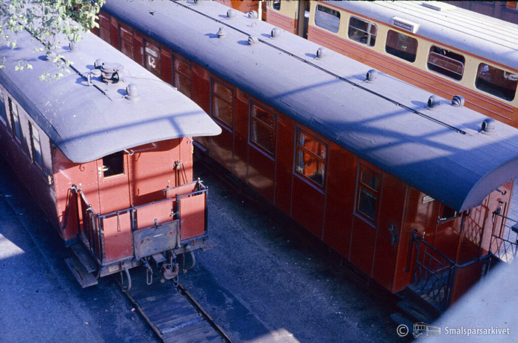 Smalspåriga personvagnar vid Växjö station. Troligen SJ Bop 742 och 743. Bakom ses SJ YBo4p 595.